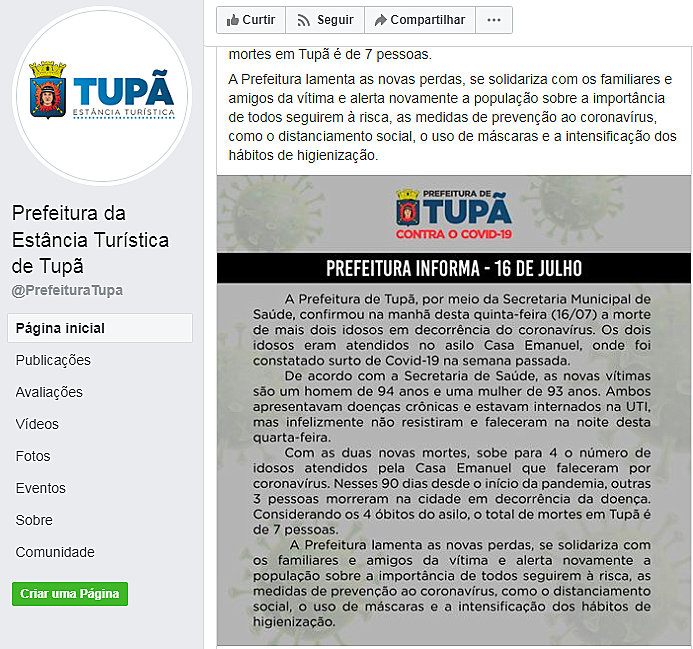 A Secretaria Municipal de Saúde de Tupã confirmou nesta quinta-feira (16/07) a morte de mais dois idosos vítimas do novo coronavírus. Eles eram atendidos no asilo Casa Emanuel, onde foi constatado surto de Covid-19 na semana passada. Agora, são quatro óbitos apenas naquela entidade e sete no total (desde o início da pandemia).