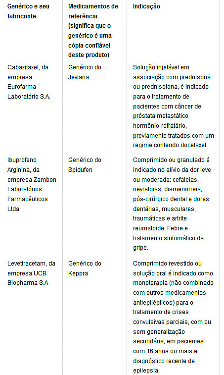 A Agência Nacional de Vigilância Sanitária (Anvisa) aprovou nesta semana o registro de três remédios genéricos inéditos no Brasil, informou o Portal Brasil. Os três novos remédios genéricos foram aprovados para o tratamento de câncer de próstata (cabazitaxel), dores leves e moderadas (ibuprofeno arginina) e crises convulsivas (levetiracetam).