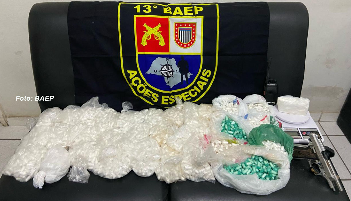 Ele tinha várias passagens criminais. Grande quantidade de drogas foi apreendida no local (foto).
