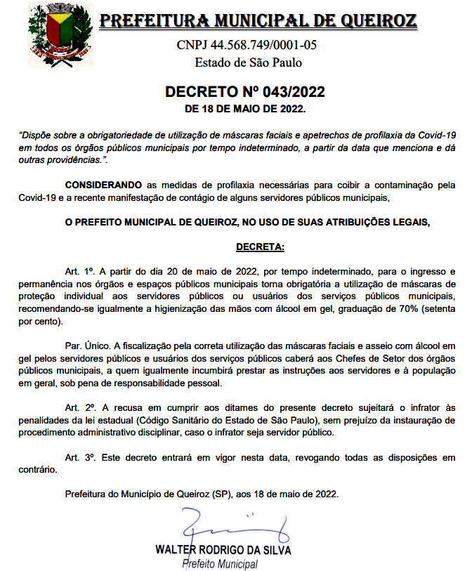 O uso de máscaras em Queiroz é obrigatório aos servidores públicos e também pela população em geral ao ingressar e permanecer nos órgãos e espaços públicos municipais.