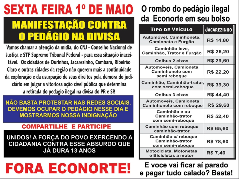 POLÊMICA - Há 9 anos que uma Ação Cível Pública que julgou o pedágio (Econorte) na divisa SP/PR (Ourinhos - Marques dos Reis) ilegal por vários motivos tramita nos tribunais. Atualmente, permanece no STF - Supremo Tribunal Federal - aguardando o julgamento. A ação que pede a retirada do pedágio já passou por três instâncias da justiça.