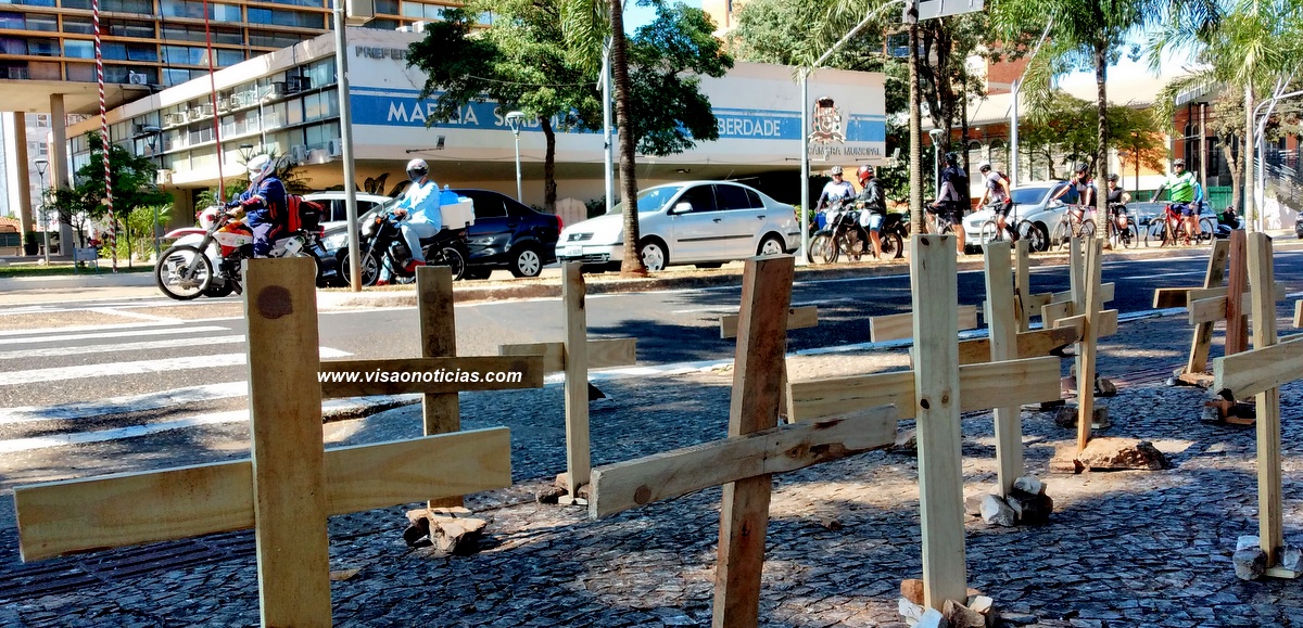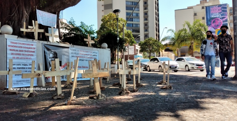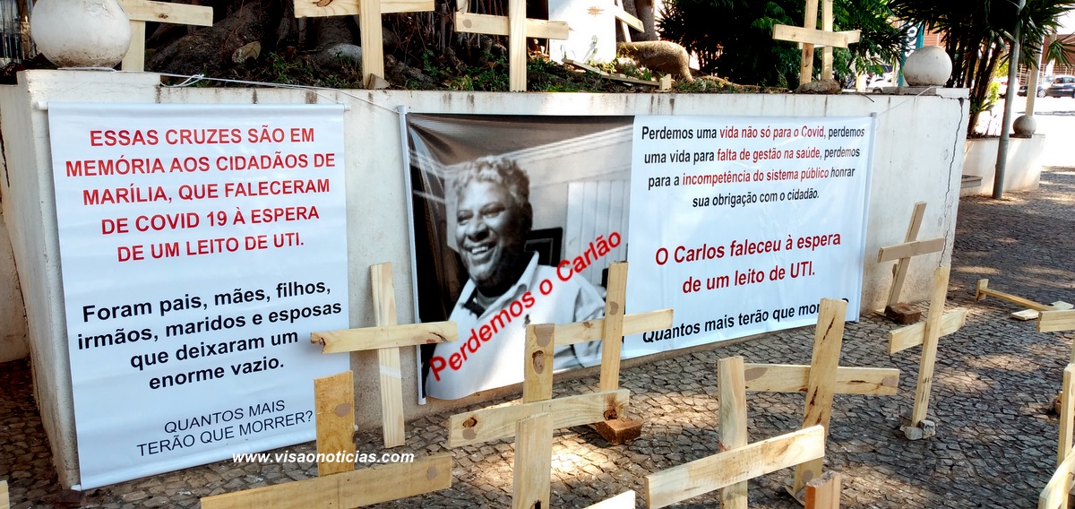 "Essas cruzes são em memória aos cidadãos de Marília que faleceram de Covid-19 à espera de um leito de UTI. Foram pais, mães, filhos, irmãos, maridos e esposas que deixaram um enorme vazio", diz uma das faixas.