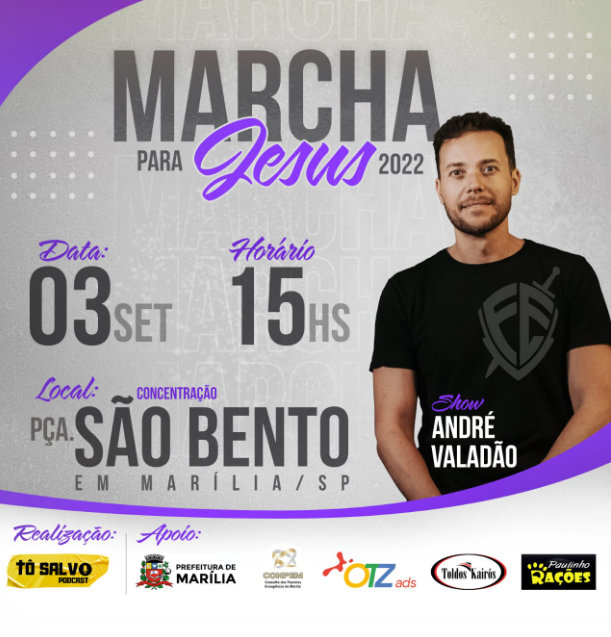 Marília recebe a Marcha pra Jesus 2022 neste sábado (03 de setembro). O evento é gratuito e será aberto ao público (estimativa de 40 mil pessoas). A concentração será na Praça Maria Izabel (Igreja São Bento), onde a passeata sairá às 15h00 com trio elétrico.