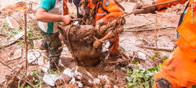 BUSCAS: Após o colapso das barragens da mineradora Samarco, que soterrou quase todo o distrito de Bento Rodrigues, em Mariana, bombeiros trabalhavam na segunda-feira incansáveis na busca pelo corpo de um menino de 7 anos com a ajuda de seu pai.