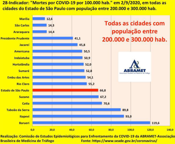Na reunião foi apresentado também um levantamento da Abramet (Associação Brasileira de Medicina de Tráfego), que mostra Marília com o melhor índice do estado entre 20 cidades com mais de 100 mil habitantes no indicador “mortes por Covid-19 por 100 mil habitantes”, até o último dia 2 de setembro.