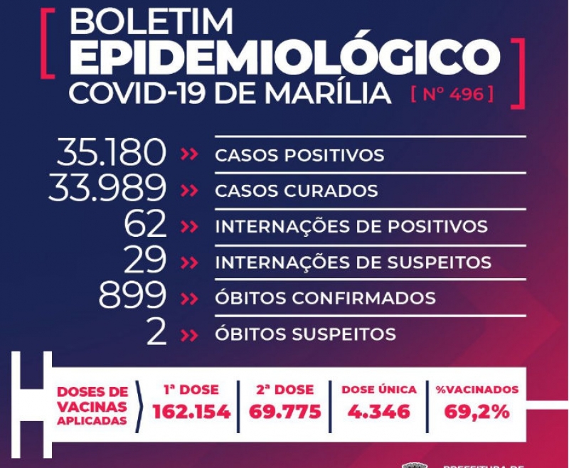 A Prefeitura de Marília, por meio da Secretaria Municipal da Saúde, confirmou na manhã desta quinta-feira, dia 12 de agosto, mais duas mortes por Covid-19, chegando a 899 óbitos pela doença no município.