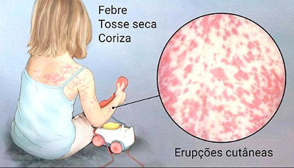 O QUE É? O sarampo é uma doença viral aguda, altamente contagiosa, que apresenta sintomas como febre, tosse, coriza, conjuntivite e manchas avermelhadas na pele.