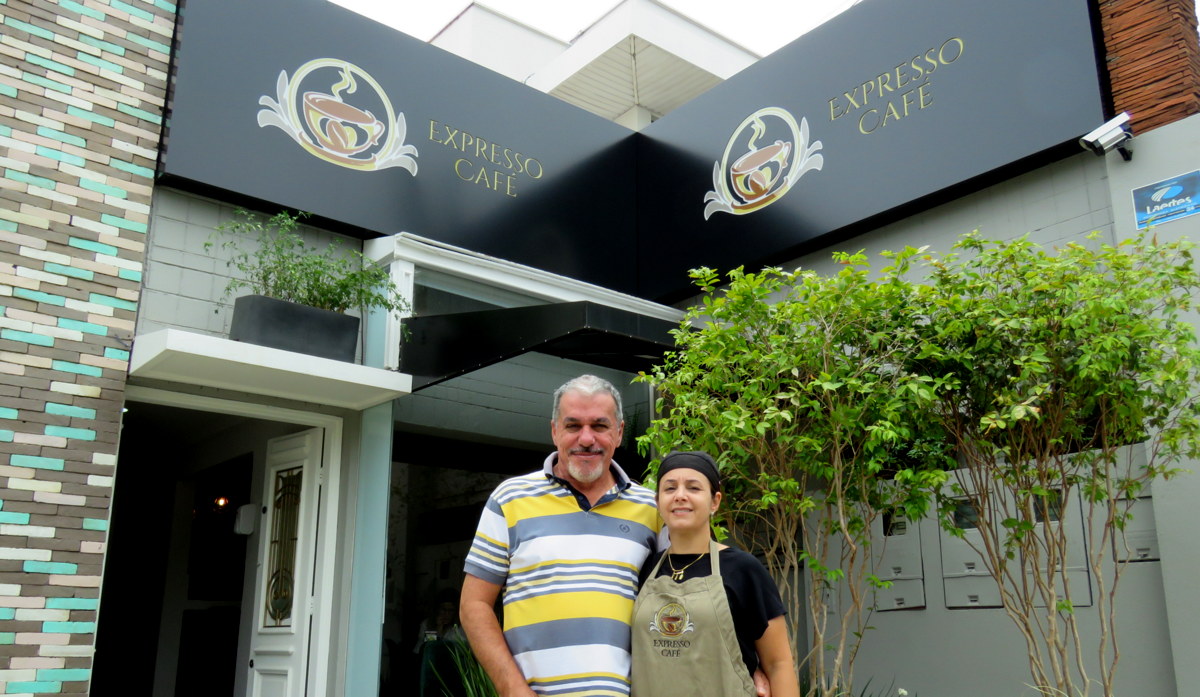 O empresário Valdelício Benetti Júnior e sua esposa, Valdeli, à frente do Expresso Café