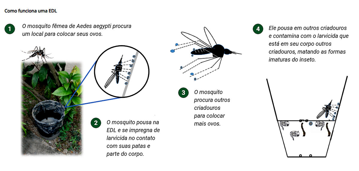 A Estação Disseminadora de Larvicida funciona da seguinte forma: o mosquito fêmea de Aedes aegypti procura um local para colocar seus ovos; ele pousa na EDL e se impregna de larvicida no contato com suas patas e parte do corpo; o mosquito procura outros criadouros para colocar mais ovos; e ele pousa em outros criadouros e contamina com o larvicida que está em seu corpo outros criadouros, matando as formas imaturas do inseto.