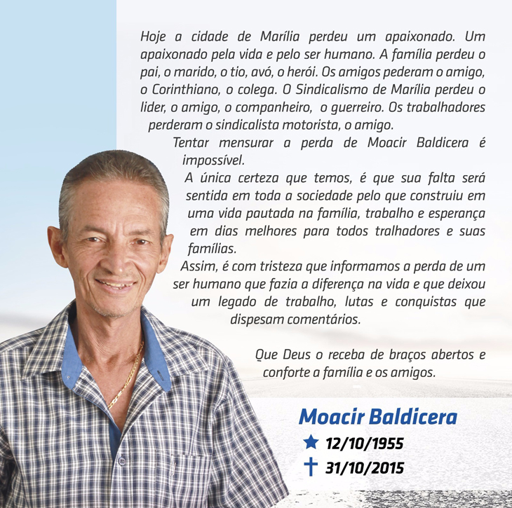 Motorista de profissão, Moacir Baldicera há mais de 10 anos fazia parte do Sindicato da categoria. No ano passado foi reeleito presidente. Segundo amigos, mesmo doente ele não se afastou da entidade. Ele deixa filhos e netos.