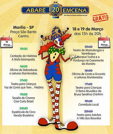 A caravana do projeto Abaré 20 anos Emcena se apresenta em Marília no próximo fim de semana (dias 18 e 19), com programação cultural gratuita e diversificada.