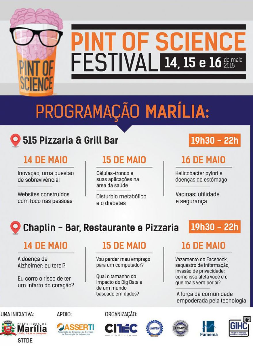 Pela primeira vez a cidade de Marília está recebendo o Festival Pint Of Science, que acontece a partir de hoje (segunda-feira) até quarta-feira (16), com programação das 19h30 às 22h no 515 Pizzaria & Grill Bar e no Chaplin – Bar, Restaurante e Pizzaria.
