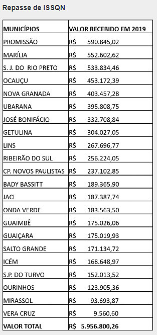 Ao todo, 22 municípios lindeiros são contemplados. De janeiro a dezembro do último ano, os que mais receberam o repasse do imposto foram as cidades de Promissão, Marília e São José do Rio Preto com pagamentos de R$ 590.845,02, R$ 552.602,62 e R$ 533.834,46, respectivamente.