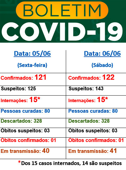 A cidade permanece com 80 pessoas curadas, 15 internações (apenas uma com exame positivo), 328 exames descartados e sem alterações na questão de óbitos: um confirmado e três aguardando exames.