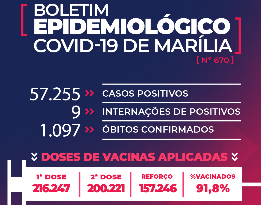 O novo boletim oficial divulgado no começo desta tarde pela Secretaria Municipal da Saúde de Marília aponta que em apenas 24 horas a cidade teve o registro de 331 novos casos positivos de Covid-19 (agora são 57.255 exames positivos da doença). Além disso, em dois dias foram registradas quatro mortes pela doença, três ontem e uma hoje, totalizando 1.097 óbitos.