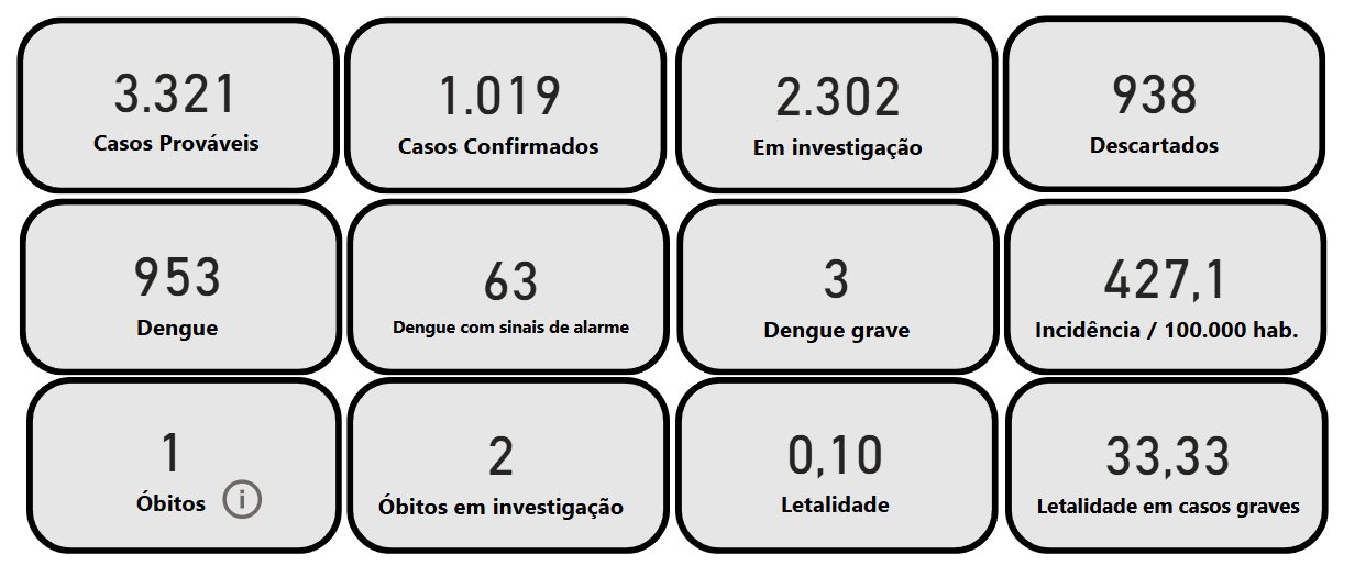 Dos 1.019 casos de dengue, 63 deles são considerados em "situação de alarme", ou seja, indica a possibilidade de gravidade do quadro clínico e de evolução para dengue hemorrágica e/ou síndrome do choque da dengue.
