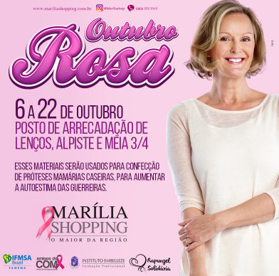 Outubro Rosa: Seguindo a programação para o Outubro Rosa, até o dia 22 de outubro, o Marília Shopping recebe posto de coleta de lenços; chapéus; alpiste e meias ¾ de poliamida femininas fios 20 ou 40.