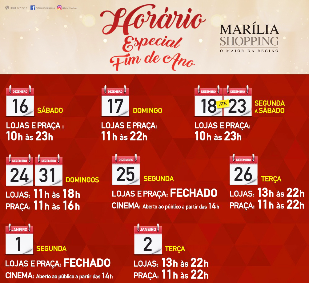Com a chegada das festas de final de ano, o Marília Shopping, para atender à necessidade dos consumidores que vão as compras nesta época, ampliou seu horário de