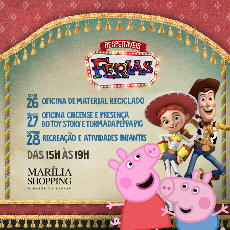 Entre as atrações, a diversão fica por conta da presença VIP do Toy Story e da turma da Peppa Pig que estarão no centro de compras para fazer fotos com crianças e adultos de todas as idades.