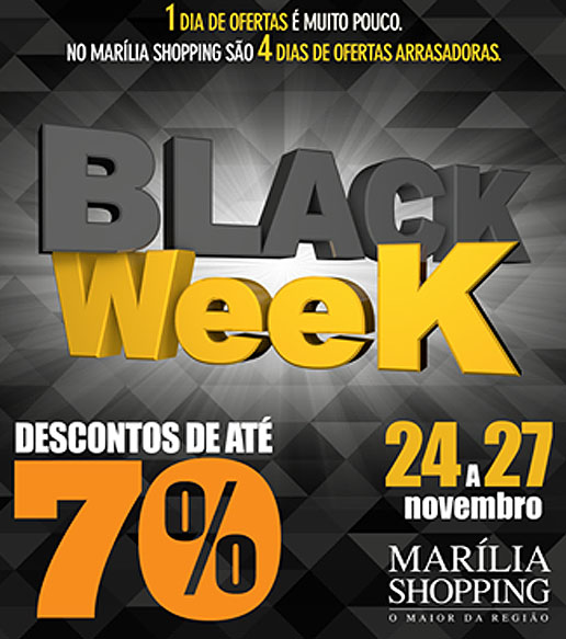 E, para fazer dessa, uma excelente oportunidade para passar momentos muito agradáveis, durante a Black Week, os clientes ainda poderão aproveitar as variedades gastronômicas da praça de alimentação, assistir um bom filme em uma das salas de cinema e se divertir com os eventos que o Marília Shopping oferece durante esses dias. A programação inclui as visitas ao Papai Noel e à Decoração de Natal, que apresenta como tema o Shrek.