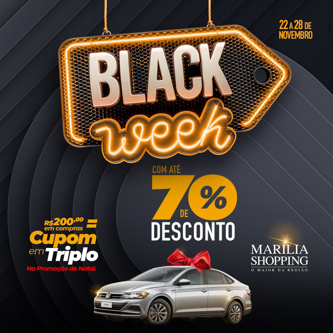 Em comemoração à ação de vendas onde lojas do mundo todo oferecem produtos com descontos especiais, o Marília Shopping promove a partir de segunda-feira (22) até domingo (28 de novembro), a Black Week, que traz descontos de até 70% em itens de moda, acessórios, beleza, casa, eletrônicos, infantis, entre outros.