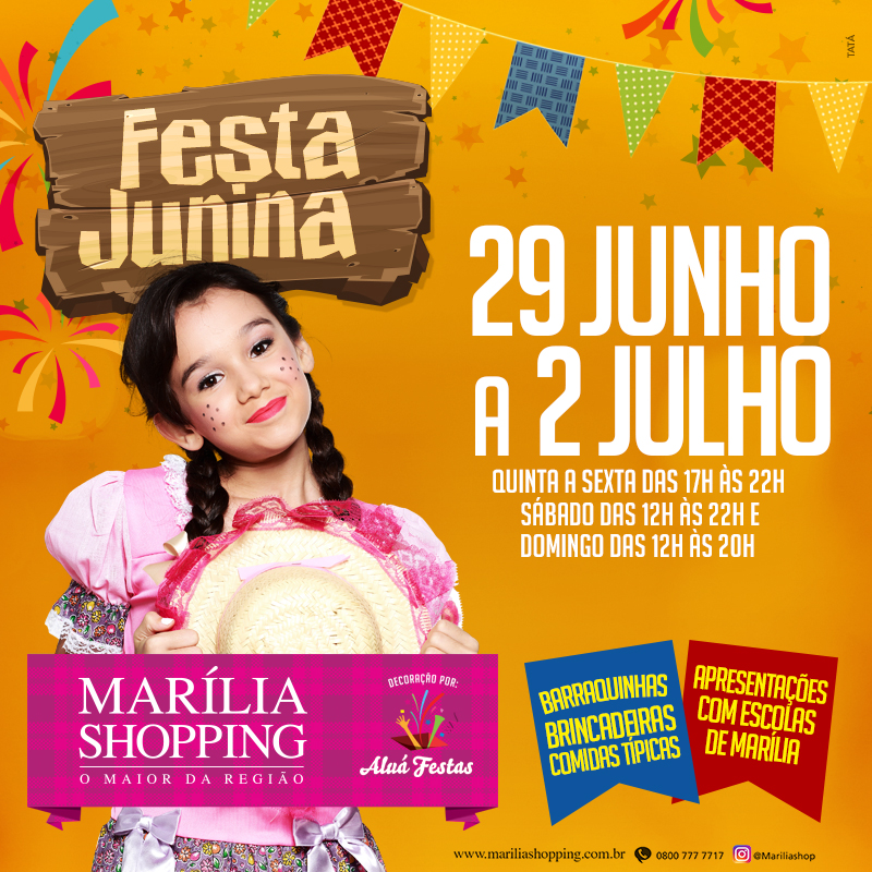 Com entrada franca, a Festa Junina acontece no Marília Shopping nos dias 29 e 30 de junho das 17h às 22h. Já no sábado (1º), o horário da diversão será das 12h às 22h e no domingo (2), das 12h às 20h.