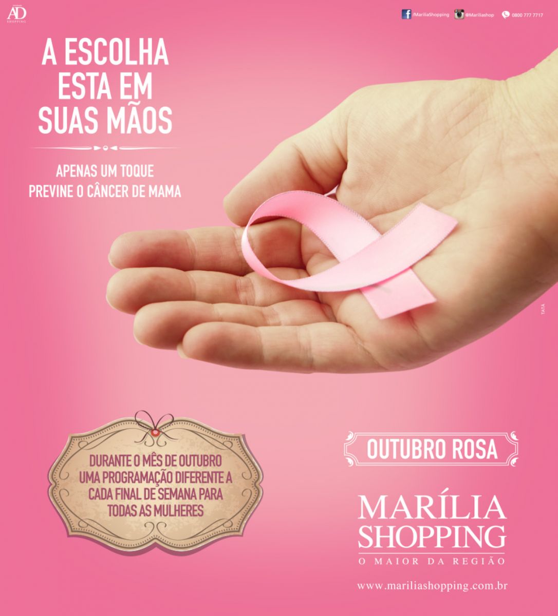 O Outubro Rosa, ação social que remete ao símbolo mundial da luta contra o câncer de mama e estimula o engajamento da população, empresas e entidades, terá novamente a participação do Marília Shopping que, além da iluminação de sua fachada em rosa, trará uma série de atividades para orientação e sensibilização sobre a necessidade e a importância da prevenção e de um diagnostico precoce.