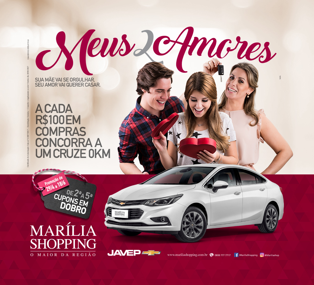Mas, como as maiores emoções da vida chegam sempre acompanhadas de um grande presente, o Marília Shopping comemora junto com seus consumidores essas datas tão significativas, trazendo um toque especial através do sorteio de um Chevrolet Cruze 0km na campanha “Meus Dois Amores”.