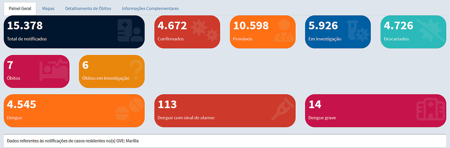 Marília está com 4.672 casos confirmados de dengue desde o começo do ano até hoje, conforme boletim diário divulgado pela Secretaria Estadual da Saúde. Além de sete mortes já confirmadas pela doença, existem outros seis óbitos em investigação. Hoje, o município anunciou a ampliação do horário de atendimento em oito unidades de saúde (até às 19h), visando justamente atender pessoas com sintomas de dengue.