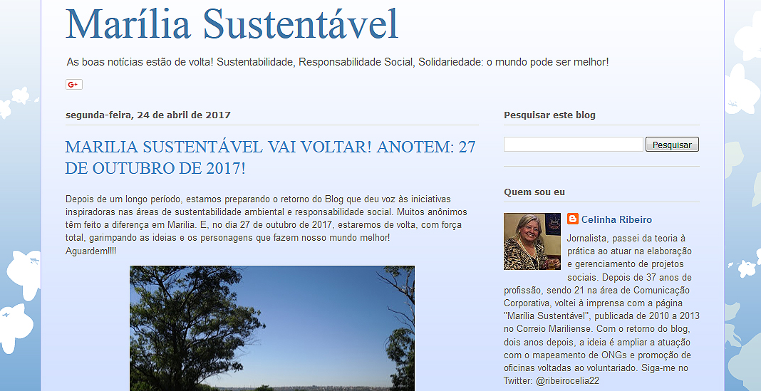 “É um lugar para se ler as boas notícias, conhecer ideias inspiradoras, os projetos que deram certo e aqueles que dependem de ajuda para decolarem. Desde 2010, o blog, que nasceu como uma extensão da página publicada aos domingos, no Jornal Correio mariliense, dá visibilidade aos personagens que fazem acontecer”, explicou Célia Ribeiro.