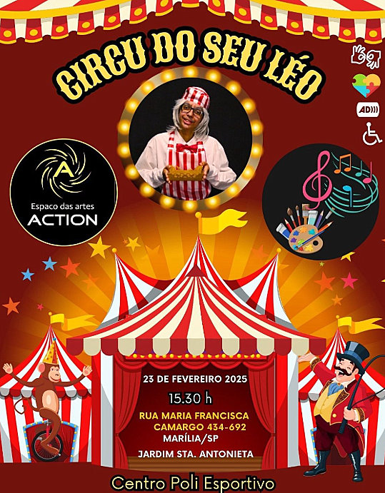 A Secretaria Municipal da Cultura de Marília, apresenta neste domingo (23), às 15h30, no poliesportivo do bairro Santa Antonieta, o Circo do Seu Léo. Com entrada gratuita, o evento será realizado pela Action Espaço das Artes, com apoio da Lei Paulo Gustavo, da Secretaria da Cultura, Economia e Indústrias Criativas do estado de São Paulo.