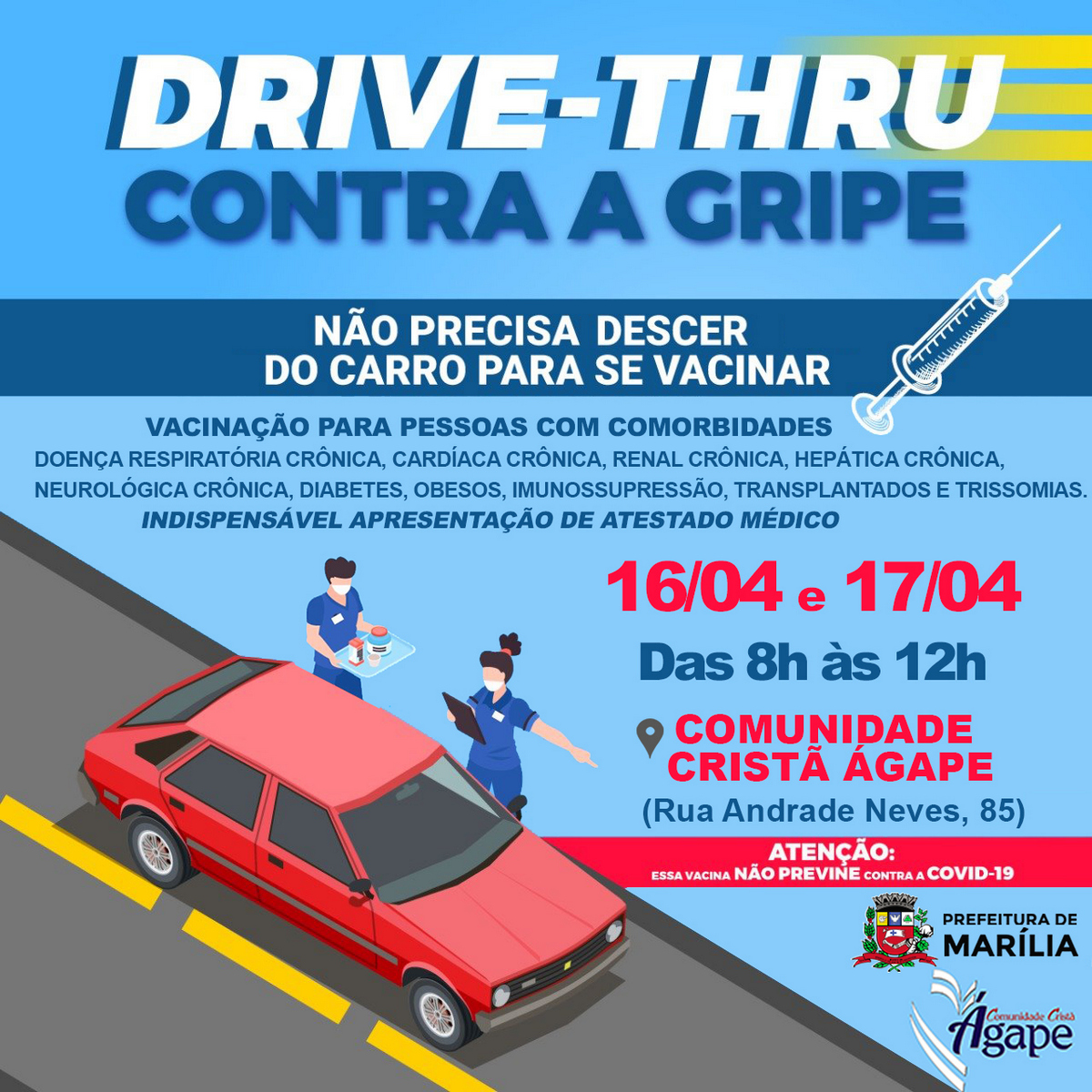 A Secretaria Municipal de Saúde realizará nas próximas quinta e sexta, entre 8h e 12h, no pátio da Comunidade Cristã Ágape um drive thru de vacinação contra a gripe exclusivamente para pessoas com comorbidades, ou seja, doença respiratória crônica, cardíaca crônica, renal crônica, hepática crônica, neurológica crônica, diabetes, obesos, imunossupressão, transplantados e trissomias.