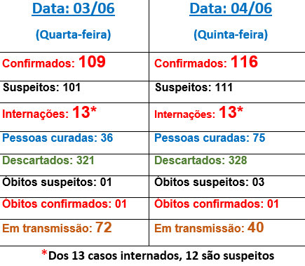 Foram confirmados mais sete casos, totalizando agora 116 casos. Das pessoas em transmissão (internados ou isolados em casa) houve uma redução de 45%. Hoje são 40 casos e até ontem eram 72).