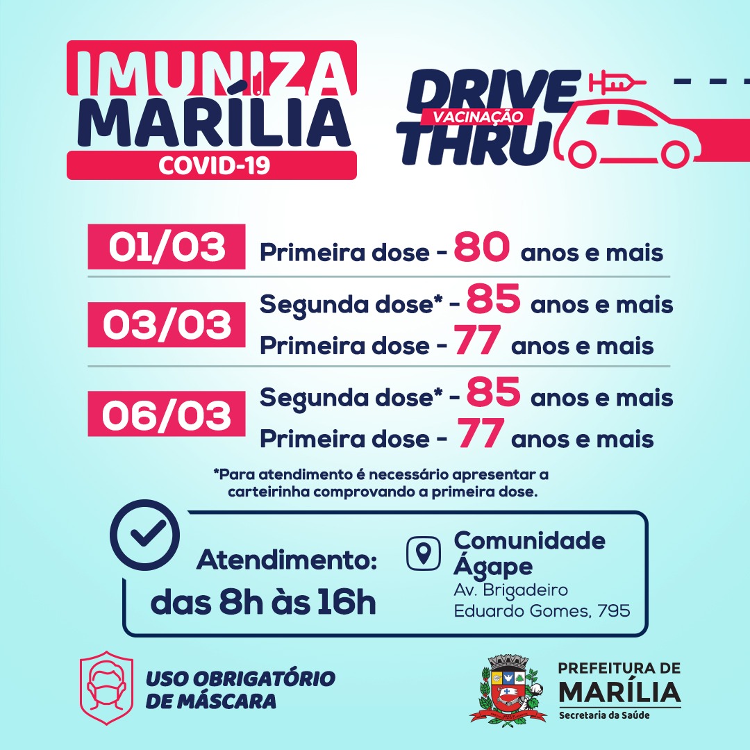 Na quarta-feira, haverá novo Drive Thru, na Comunidade Ágape, também das 8h às 16h, tendo como público alvo duas faixas etárias: idosos com 77 anos e mais (receberão a primeira dose da vacina) e idosos com 85 anos e mais (receberão a segunda dose).