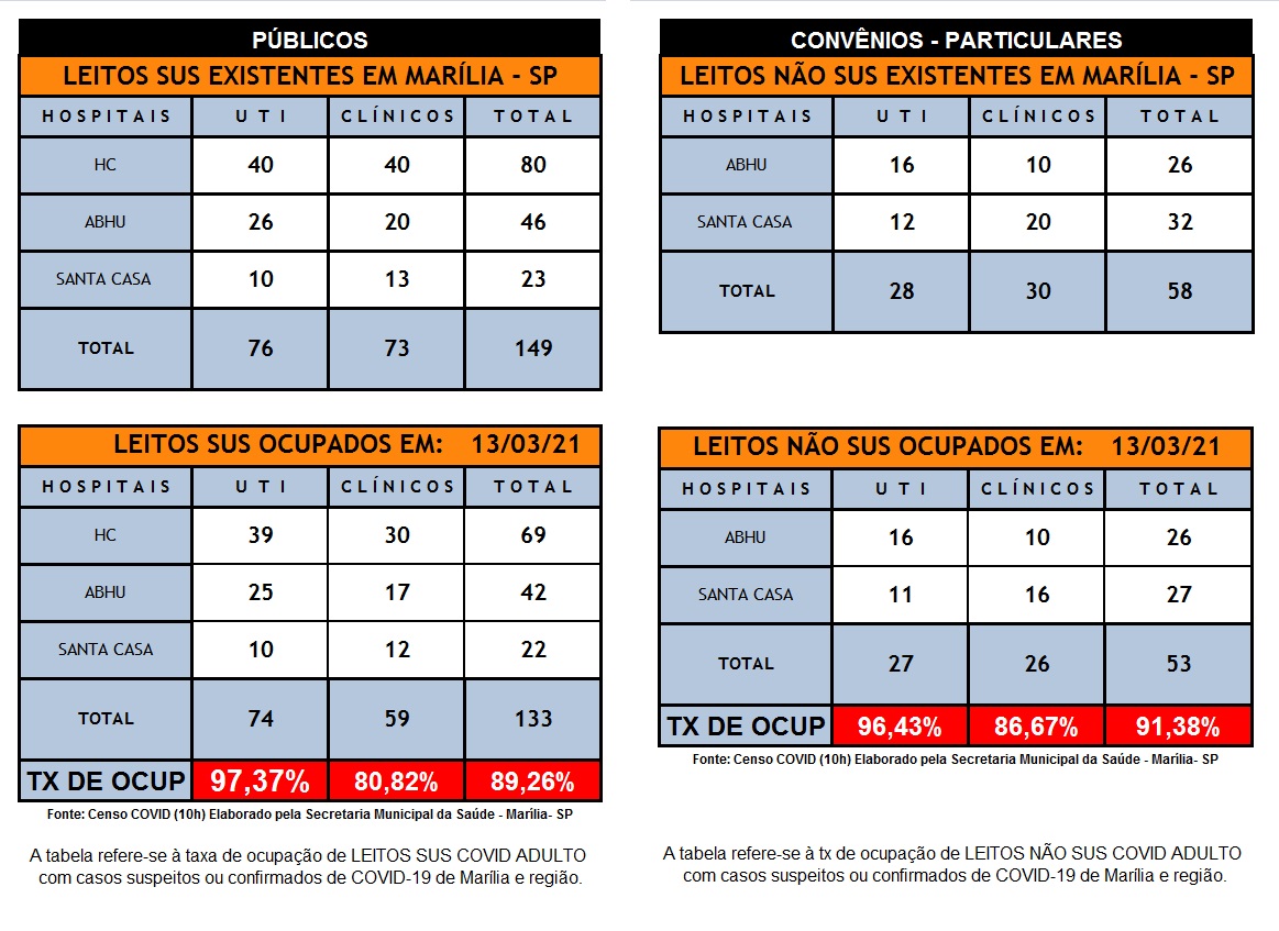 Havia apenas uma vaga na Santa Casa de Assis. Portanto, o índice regional era de 99,39% de ocupação. No total, a região tem 164 leitos SUS de UTI.