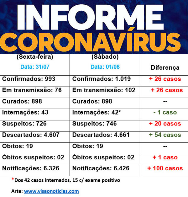 De acordo com boletim divulgado pela Secretaria Municipal da Saúde, oficialmente são 1.019 notificações positivas, com os 26 novos exames positivos, entre os 100 que foram feitos nas últimas 24 horas.