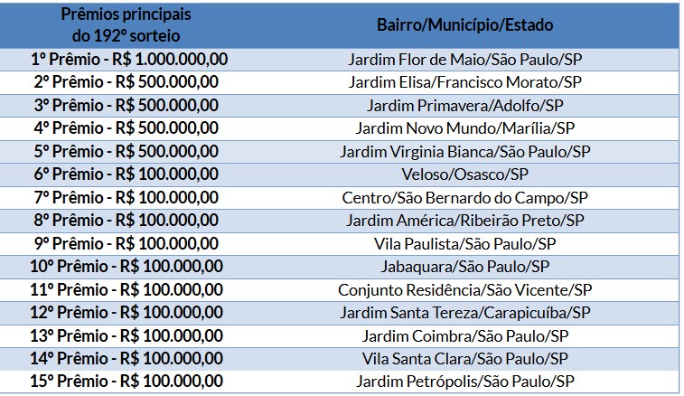 Além de Marília, na 192ª extração do programa da Secretaria da Fazenda e Planejamento do Estado de São Paulo, os demais prêmios de R$ 500 mil, saíram para as cidades de Adolfo (a região de Rio Peto); Francisco Morato e para Capital (bairro Jardim Virgínia Bianca). Esse é o segundo maior valor da premiação destinado à pessoa física – há ainda outros 10 prêmios de R$ 100 mil (veja lista).