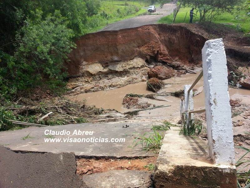 A ponte não resistiu à força da enxurrada. Caiu e formou-se uma grande erosão.