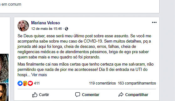"Não sei o rostinho de nenhum deles, porque aquele monte de proteção não permitia, mas se algum de vocês está lendo isso aqui, tanto médicos, enfermeiros, enfermeiras, fisioterapeutas, as profissionais da limpeza...gostaria de dizer que vou usá-los pra sempre como exemplo de profissionais e dedicação, principalmente de HUMANIDADE! Não mediram esforços, usaram todos os recursos, para saberem como melhor tratar. Obrigada por tudo, provavelmente salvaram minha vida", afirmou.