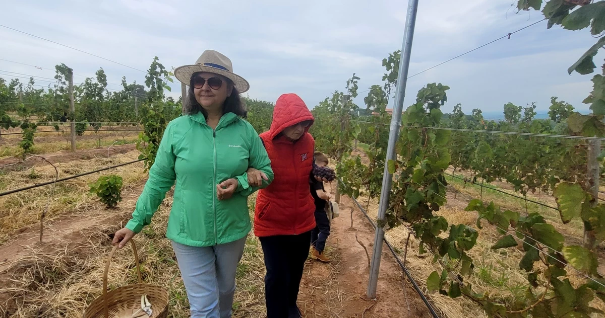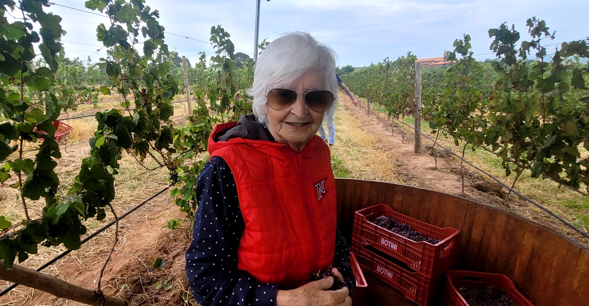 A mais idosa da "festa da colheita" foi dona Nadir Cesar de Moraes Convento. Aos 93 anos, ela estava bastante animada ao colher os cachos de uva. Aliás, como a maioria dos visitantes, ela nunca tinha vivido essa experiência.