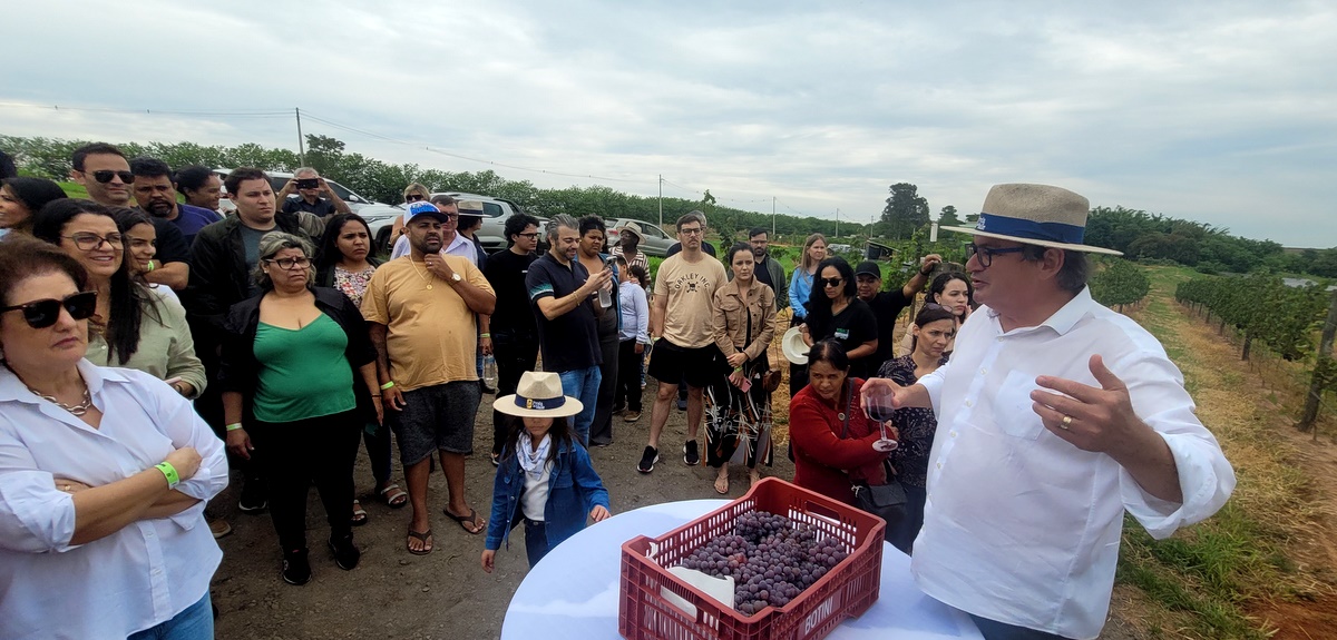 Daniel Alonso explica aos visitantes a importância da vinícola para a economia e turismo de Marília.