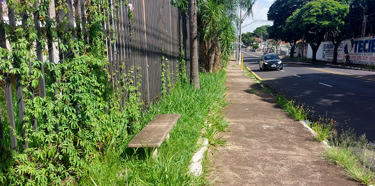 Ponto de ônibus em frente ao ginásio de esportes também está com mato alto.