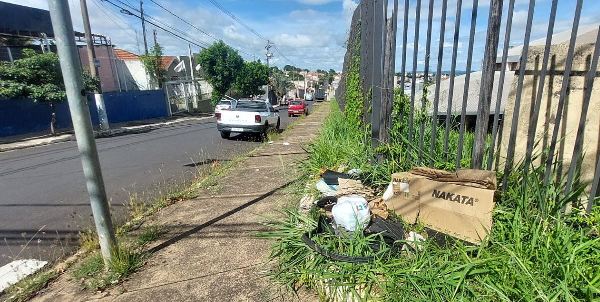 Além do mato alto, até lixo está sendo jogado na calçada do ginásio de esportes Neusa Gelttti.