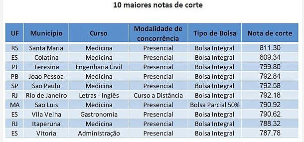 Veja os dez cursos com as maiores notas de corte no ProUni: