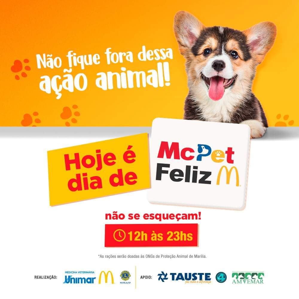 O curso de Medicina Veterinária da Universidade de Marília (Unimar), em parceria com o McDonald’s e o Lions Clube, realiza neste sábado, das 12h às 23h, o “Mc Pet Feliz”. O projeto é inédito e tem como propósito contribuir com as Ongs de Proteção Animal da cidade, através da arrecadação de quilos de ração para cães e gatos.