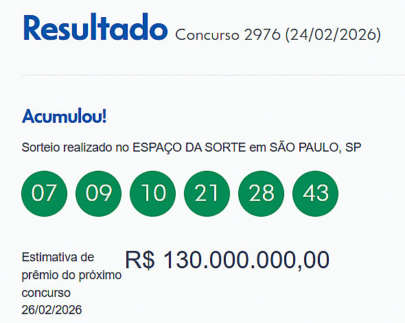 O próximo concurso, o de número 2.976, é na terça-feira (24). As apostas podem ser feitas até as 20h, horário de Brasília, do dia do sorteio, nas casas lotéricas credenciadas pela Caixa, em todo o país ou pela internet. A aposta simples, com seis números marcados, custa R$ 6.