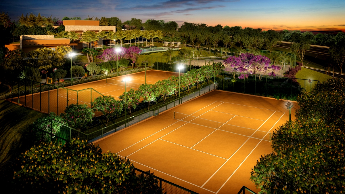 Vista aérea da quadra de tênis do condomínio de alto luxo, contornado por 80 mil m² de mata nativa.