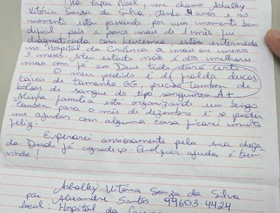 "Olá, Papai Noel, me chamo Ashalley Vitória, tenho 4 anos, e estou passando por um momento bem difícil, pois há pouco mais de um mês fui diagnosticada com leucemia, estou internada... há mais ou menos 3 meses. Meu estado não é dos melhores. O meu pedido é de fraldas descartáveis GG e bolsas de sangue A+".