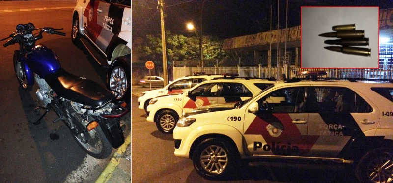De acordo com informações da PM, as equipes realizavam patrulhamento contra roubo e furto de veículos quando na rua Cícero Guanaes Simões, um indivíduo empreendeu fuga ao avistar as viaturas. Houve um breve acompanhamento, sendo que o condutor abandonou a moto pela rua Valdemar Pereira Matias e correu para dentro de uma casa. Após cerco policial, L.F.G acabou detido. Com ele, três munições no calibre 7,62 (de fuzil) e uma de calibre .38 foram localizadas.