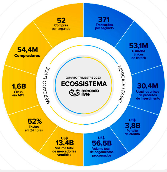 O Mercado Livre é considerada a principal plataforma de e-commerce da América Latina, operando em 18 países. Os números impressionam: são 52 compras por segundo, envolvendo 54,4 milhões de compradores, envolvendo 13,4 bilhões de dólares (arte).